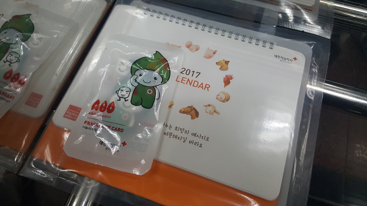 연말이어서 적십자사 달력을 주더군요. 게다가 헌혈기념품도 2종류나~