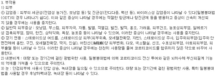 - 피부 재생 억제로 인한 궤양, 치유 지연 등의 가능성이 있습니다.