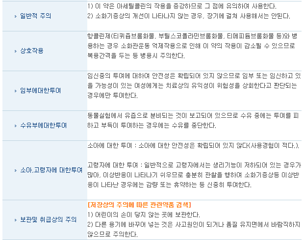 - 효능 및 효과: 기능성소화불량으로 인한 소화기증상(복부팽만, 상복부통, 식욕부진, 속 쓰림, 구역, 구토)을 완화