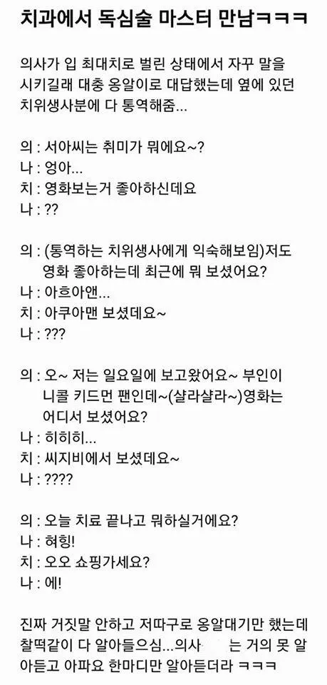 치과 의사가 일 최대로 벌린 상태에서 자꾸 말을 시키길래 대충 응알이로 대답했는데 옆에 있던 치위생사분이 다 통역해줌...