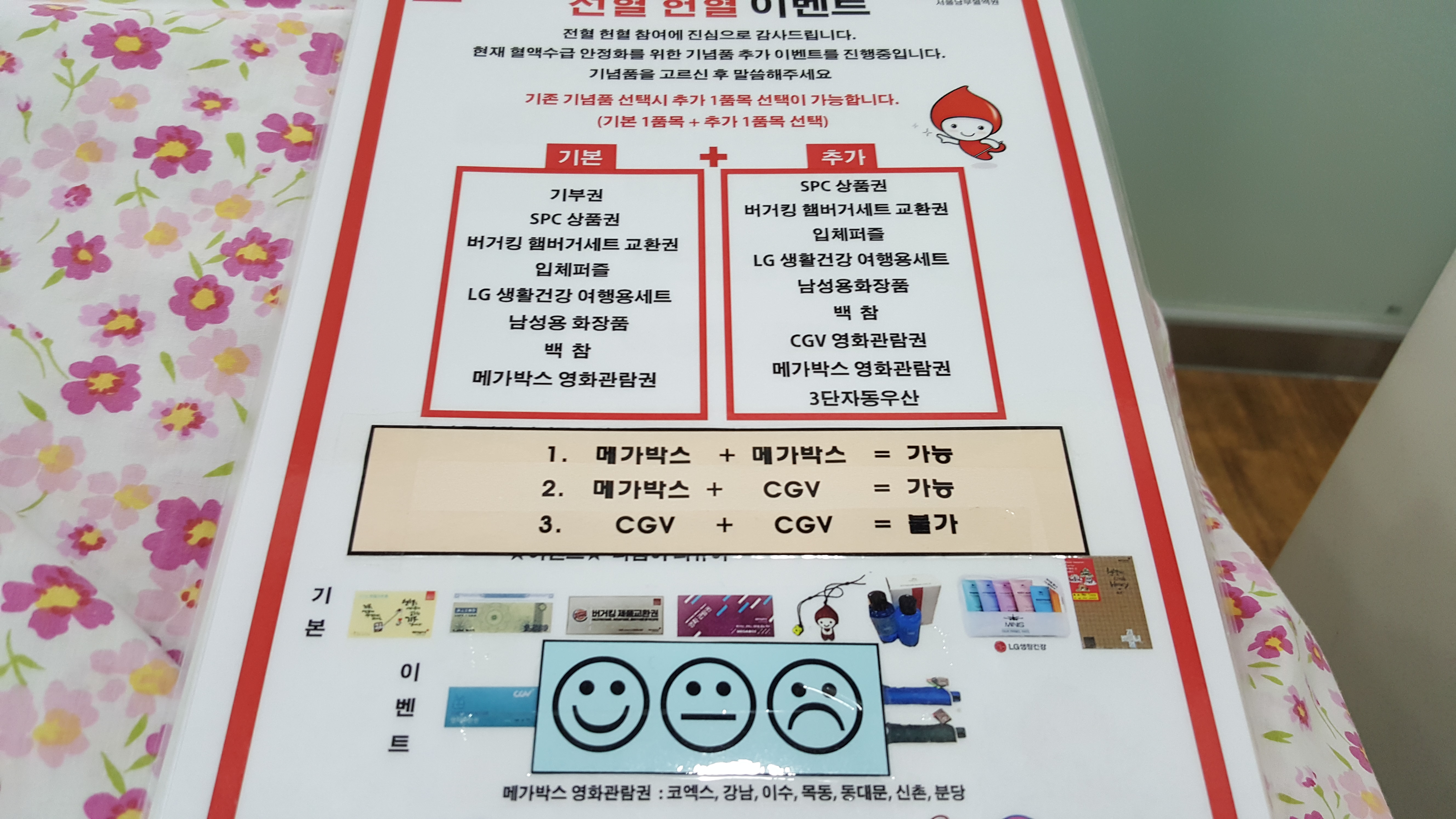 잠실역 헌혈의 집에서는 전혈 헌혈 이벤트로 전혈을 하시는 분들에게 기본 기념품 이외에 추가로 1가지를 더 주고 있어요.
