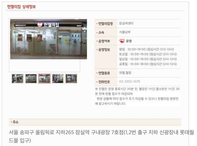 혈액원 홈페이지에 안내되어 있는 위치는 잠실역 구내 광장 7호점이라고 되어 있지만, 이 정보로 찾아가기는 힘들어요.