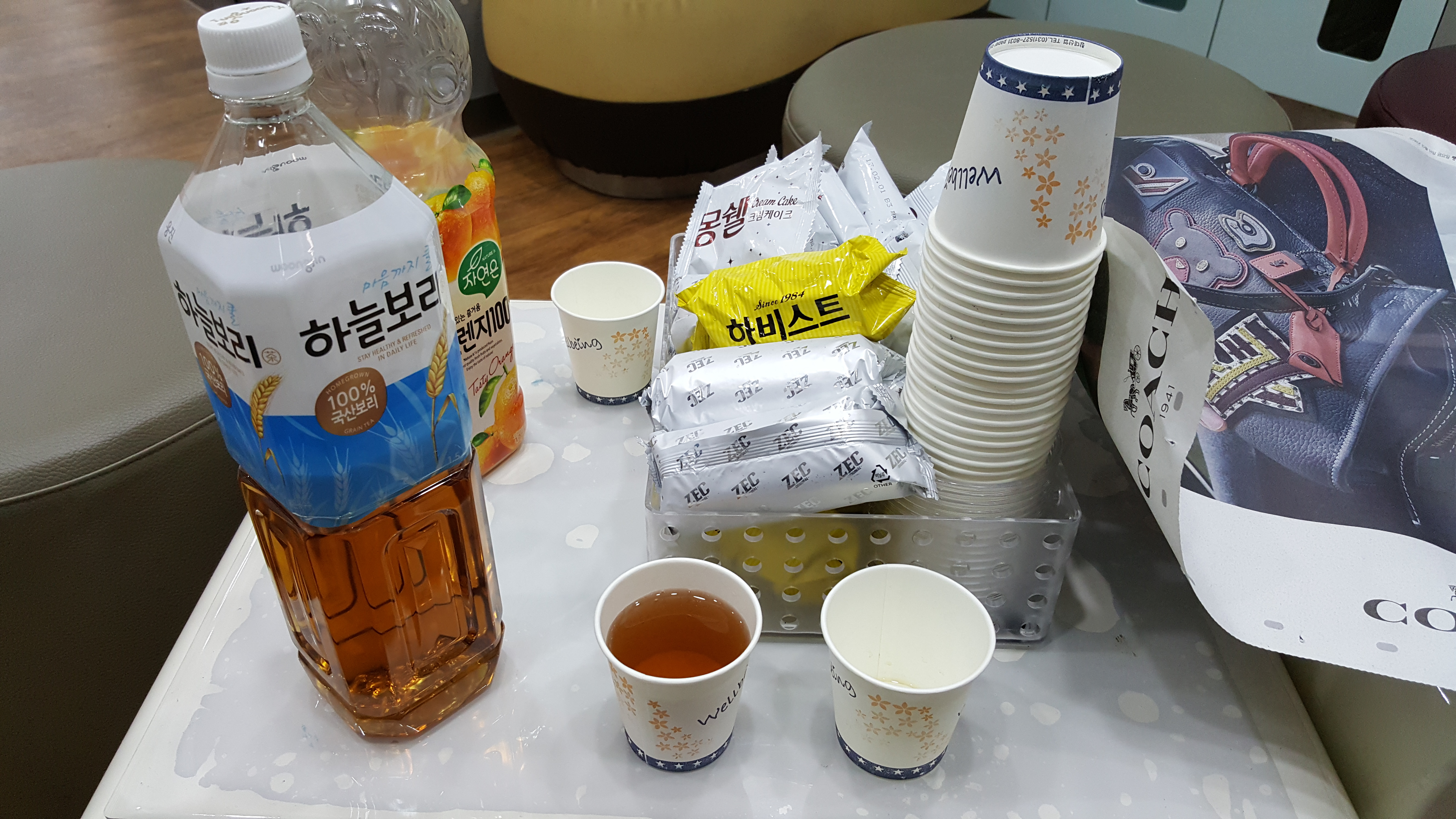 지혈밴드를 풀 때까지 잠시 쉬는 동안 몽쉘통통과 음료수를 마시고 있는데