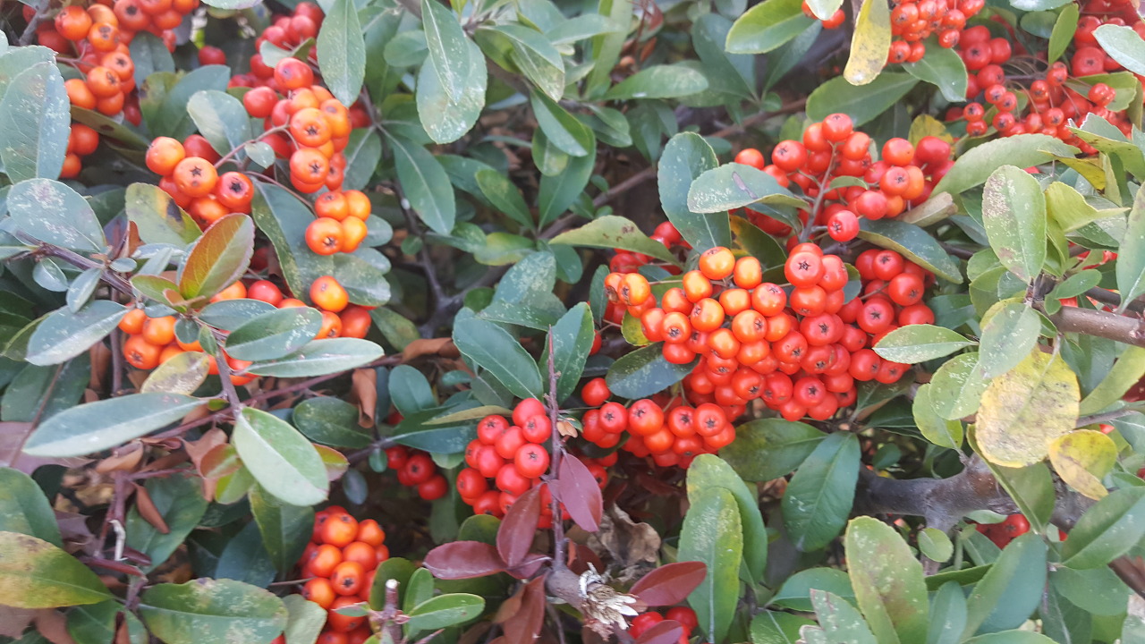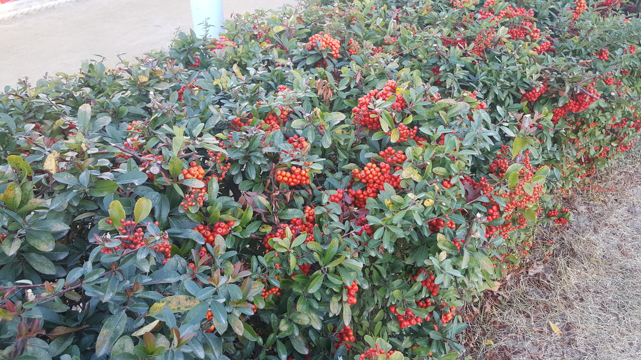 키워드: 피라칸다, Pyracantha angustifolia, 상록 관목, 빨간 열매, 새들의 먹이, 골든챠머, 겨울 풍경, 관상용 나무, 원산지 중국, 알알이 영근 사랑