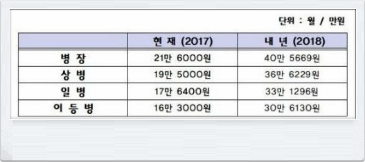 2018년 병장월급이 40만 원대로 전년대비 88%나 인상되었습니다.