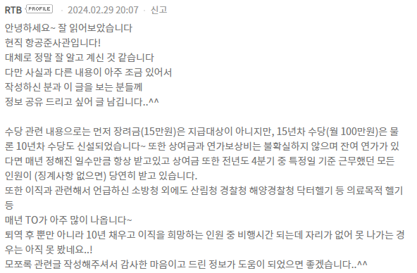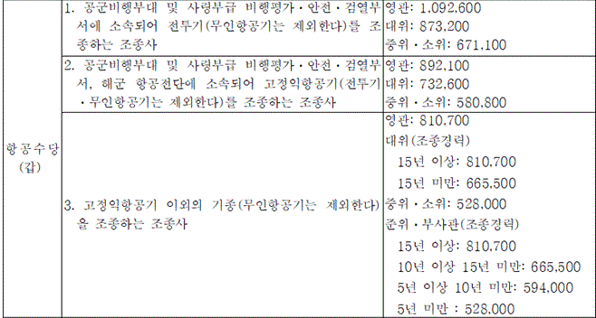 참고로 회전익 항공기 조종사인 육군항공준사관이나 장교들은 15년 이상 복무시 지급되는 조종사의 군인장려수당 100만원을 받진 못한다.